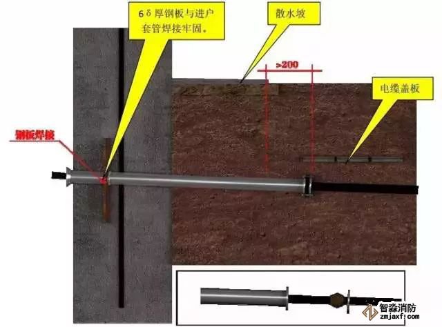 注:1、直埋电缆过墙引入管必须做好防水处理,其埋设深度距室外地面不小于 700mm,并有防水坡度(5P0P~10P0P)。