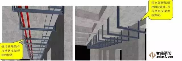 1)铁件预埋式支吊架:跟随结构施工,将铁件按照策划排布图的坐标、标高、间距定位预埋;在预埋完成的铁件上确定支吊架的水平面标高,将制作的支吊架焊接在预埋的铁件上。