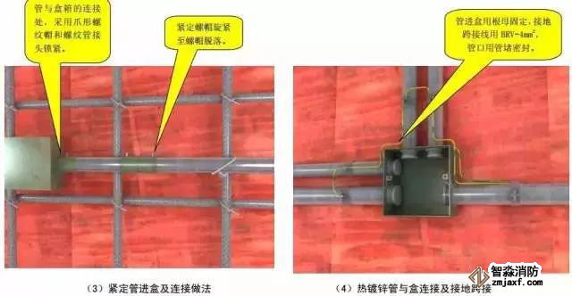 3、紧定式薄壁钢导管接地线进箱盒处采用配套的爪型锁母,管连接处拧断紧定螺钉做法。