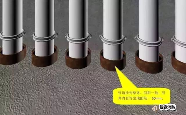 3、质量要求:所有套管的与墙平齐,出楼板的应高于地坪饰面 20mm,(卫生间和管道井应 50mm)