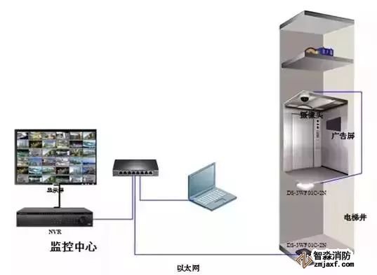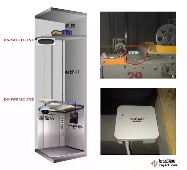 1、摄像机端安装在轿厢上部,正面朝上,使用扎带固定在轿厢上。