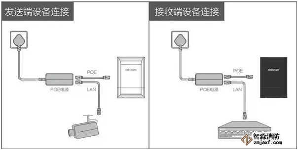 电梯网桥出厂自带POE电源,电源上的POE口使用网线连接到设备上的POE口即可给设备进行供电,机房端(接收端)POE电源LAN口(或设备上的LAN1/LAN2口)接入局域网交换机摄像机端(发送端)POE电源LAN口(或设备上的LAN1/LAN2口)可同时接入IPC、电梯网关,广告屏等设备。