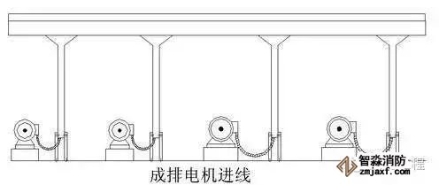 5.机房因为设备多,管线及桥架纵横交错,施工时应尽量做好综合布置,成排电机桥架进线示意如图:
