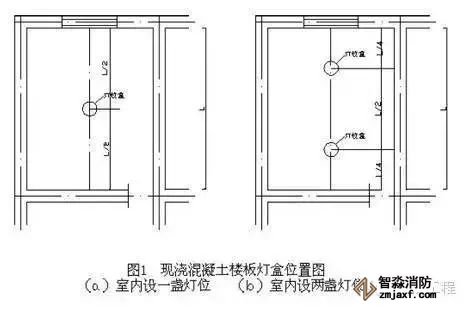 ⑴在配管前应按设计图纸确定好配电设备、各种箱、盒及用电设备位置。在楼板内配管时,在土建摸板支设完毕后,根据设计图纸在摸板上用红油漆标注灯具、插座、探测器、接线盒、配电箱的位置。当室内只有一盏灯时,其灯位盒应设在纵横墙(或梁)净尺寸中心线的交叉处;有两盏灯时,灯位盒应设在短轴线墙(或梁)净尺寸中心线与长轴线墙(或梁)净尺寸1/4 的交叉处,如图1 所示。公共建筑走廊照明灯具,应按其顶部建筑结构不同,来合理地布置灯位盒的位置,当走廊顶部无凸出楼板下部的梁时,除考虑好楼梯对应处的灯位盒外,其他灯位盒宜沿走廊中心线均匀分布,如走廊顶部有凸出楼板下部的梁,确定灯位时,应考虑到灯位与梁的位置关系,灯位盒与梁之间的距离应协调,均匀一致,力求实用美观。