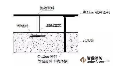 1.首先在屋面结构钢筋绑扎时,从避雷引下线柱钢筋引出Φ12mm镀锌圆钢与屋面避雷带连接,其接点做法见图:
