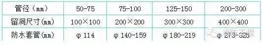 3.严格按照标准图集加工制作防水套管、穿墙套管,套管长度按结构施工图尺寸确定,套管管径参照下列标准: