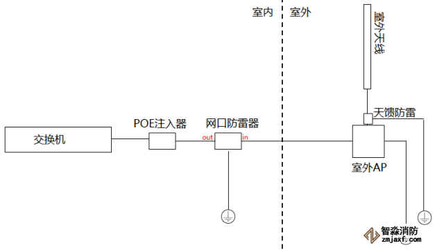 室外无线AP天线不管是全向天线还是定向天线,因为其是金属制品,安装在户外这种环境中都必须做避雷处理。天线的安装高度不可以超过避雷针。标准的做法是:天线的安装在避雷针以下,且天线的最高点在避雷针向下防护的45度角以内。以最大程度上的避免雷击天线等情况的发生。