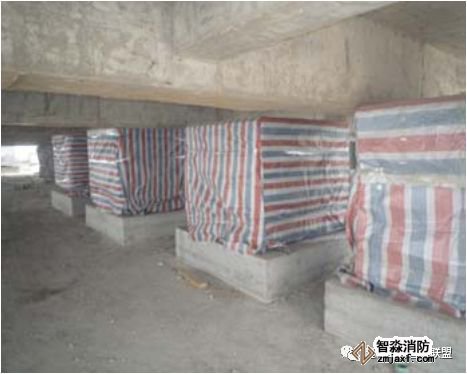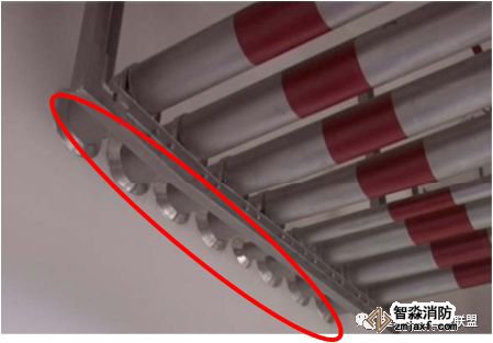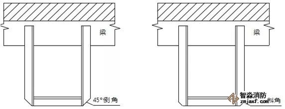 当梁、通风管道、排管、桥架宽度大于1.2 m时,增设的喷头应安装在其腹面以下部位;风管下喷头吊架应采取管道延长至风管另外一端边缘,并在延伸管道末端设置吊架