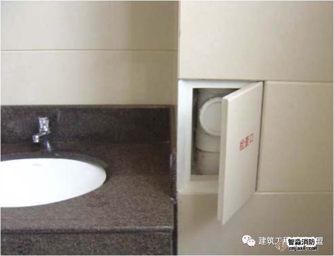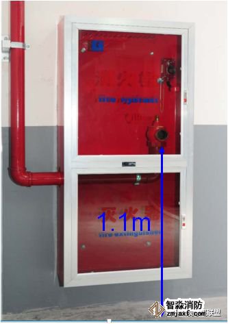 消火栓不在门轴侧,应在开启侧;消火栓口中心离地高度为1.1 米,允许偏差±10mm