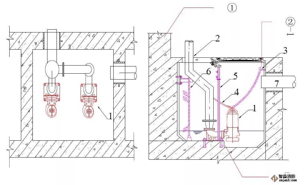 2、潜污泵排水管阀门与部件从下往上依次为:软接头—压力表—止回阀—闸阀,闸阀的安装高度为地坪完成面上1.5m,三通高度宜为地坪高度2m处