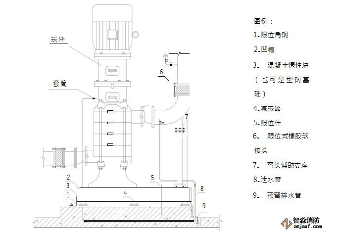 1、立式水泵底座下应设槽钢基础,扩大立式水泵基础接触面积,增加水泵平稳牢固性;槽钢基础与水泵底座螺栓刚性连接