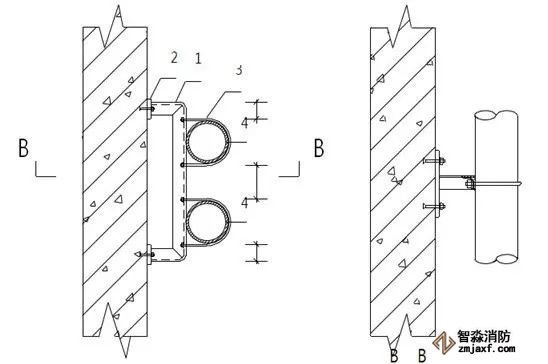 1.角钢 2.连接板(10mm,做为承重支架,当使用80以上的角钢时采用) 3.管码 4.管道