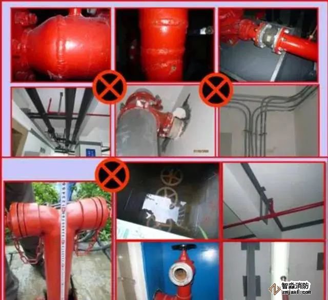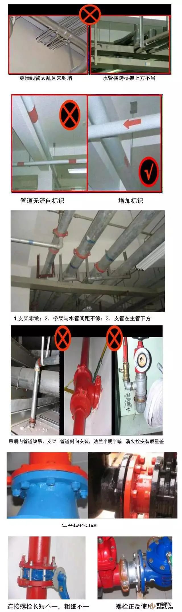 (2)自动喷水灭火系统管道倒坡现象较普遍,尤其是配水管的配水支管。管道的坡度应坡向泄水装置或辅助排水管,并应注意按规范要求设置防晃吊架。(见《GB50084-2001(2005修订)-自动喷水灭火系统设计规范》;《自动喷水灭火系统施工及验收规范》GB50261-2005)。由于管道倒坡使管内水排不出,当清洗或更换喷头时,易产生污染,极个别的采暖回水管道也有倒坡的,影响采暖效果。