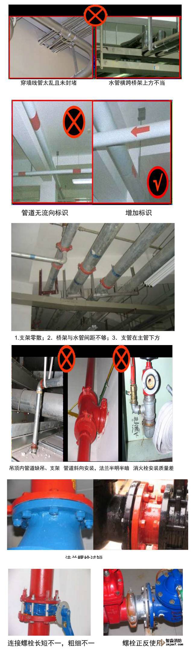(5)气体灭火系统和自动喷水灭火系统管道安装对于公称直径小的一般都采用管件丝接,对于管径较大的,如DN65、DN73、DN89及以上的有采用焊接的,但焊后只对外表面进行了防腐处理,容易造成喷头堵塞。《GB50263-97》规范第3.6.1条规定:“无缝钢管采用法兰连接时,应在焊接后进行内外镀锌处理”。“已镀锌的无缝钢管不宜采用焊接连接,与选择阀等个别连接部位需用法兰焊接连接时,应对被焊接损坏的镀锌层做防腐处理”。《GB50084-2001(2005修订)-自动喷水灭火系统设计规范》规范第5.1.3条规定:“管网安装、当管子公称直径小于或等于100mm时应采用螺纹连接;当管子公称直径大于100mm时,可采用焊接或法兰连接”。并进行防腐处理,但采取焊接连接应进行二次镀锌,《GB50242-2002》规范第4.1.3条作出了明确的规定:管径小于或等于100mm的镀锌钢管应采用螺纹连接,套丝扣时破坏的镀锌层表面及外露的螺纹部分应做防腐处理……。鲁班奖工程复查时,多项工程在这一方面存在不足,不但采用焊接连接。