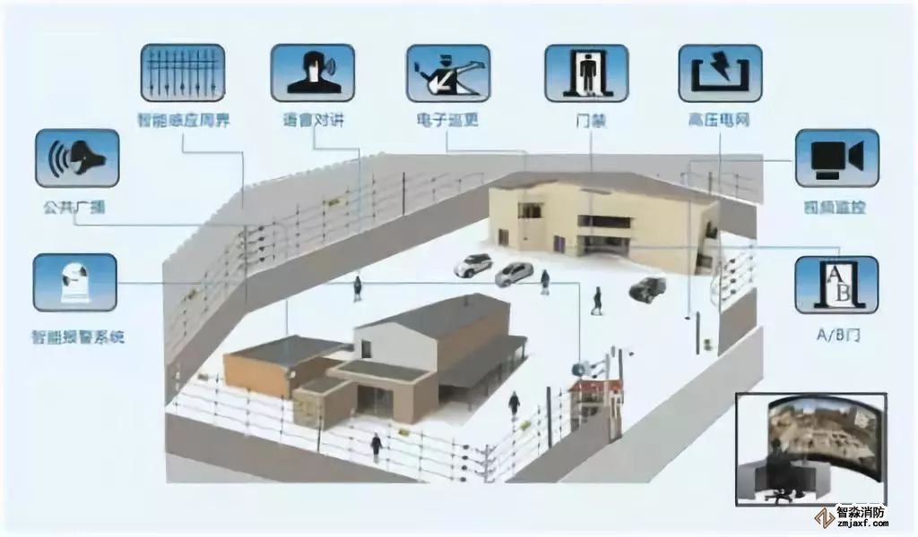 周界报警采用两种防护技术,在围墙顶端安装高压电网,在围墙内侧地面布设主动红外双光束探测器。各防区的报警信号都能与就地对应的摄像机实现报警联动,一旦发生警情,相应摄像机图像便会被自动召回,优先显示在控制台监视器上。