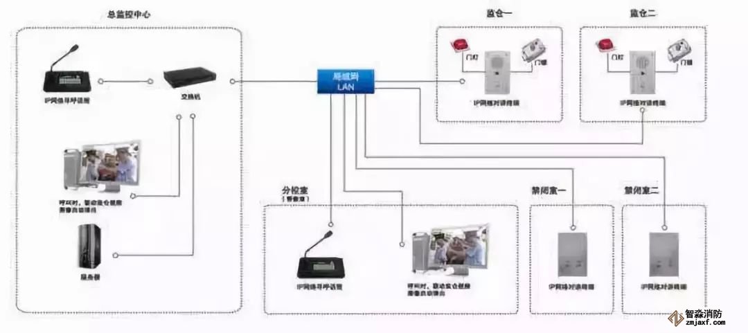 从科学管理上考虑,看守所有对被关押犯人进行思想教育的活动、晨操、通告和紧急广播等工作,一套完备的广播系统便可完成上述所有的要求,广播系统应分为两部分——仓房广播和公共区域广播。仓房广播应具备单个、群集、分区、全部仓房选通广播功能。公共区域广播主要设立在操场、周界,要实行分区管理。