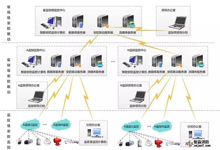 看守所系统是一个要求高安全、高稳定性的系统,系统的主要业务功能包括:一是对关押人员在仓房、监区走廊(或楼梯间)、公共活动区域、周界等活动区域的监控管理;二是对外来人员在提审室、律师接见室、家属探访室等限制区域的监控管理;三是对监狱工作人员在出入口的出入、巡更及考勤等活动内容的管理;四是为管理人员及其上级领导提供便捷地管理手段。