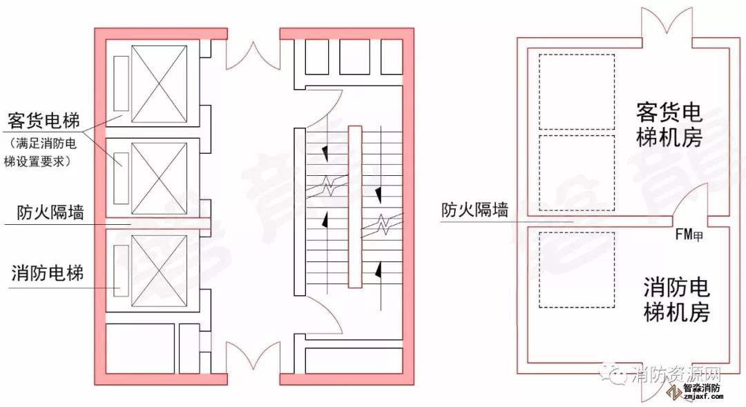 3、除满足上述要求外,乐鱼在线(中国)电梯井、机房与相邻客货电梯井、机房之间应设置耐火极限不低于2.00h的防火隔墙,隔墙上的门应采用甲级防火门(7.3.6)。