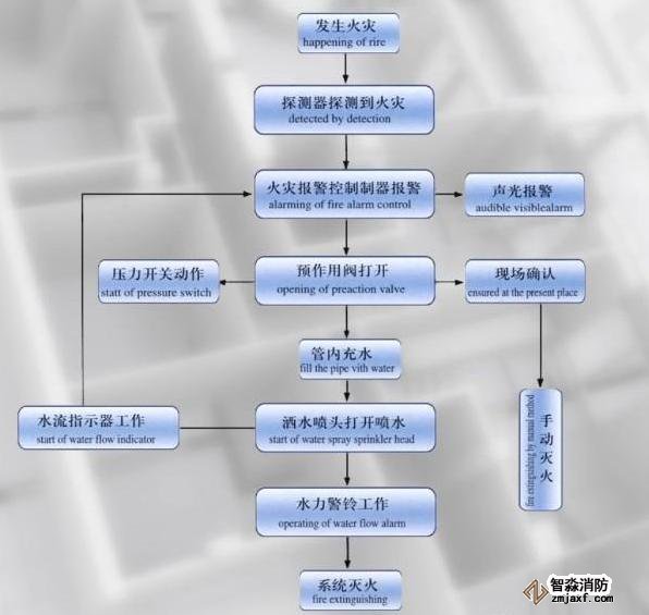 预作用自动喷水系统是一种喷头常闭的灭火系统。管网中平时也是不冲水的,当发生火灾的时候,火灾探测器报警后,由自动控制系统控制阀门排气冲水,由干式变为湿式,只有当着火点达到开启闭式系统时,才开始喷水灭火。