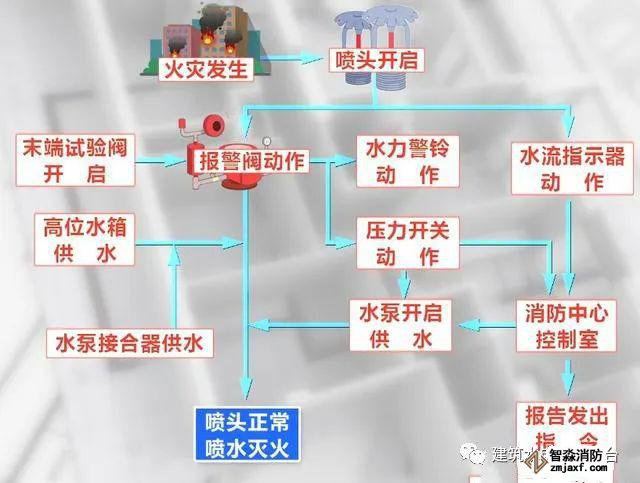 当发生火灾的时候喷头开启喷水灭火,同时报警阀和水流指示器开始动作,报警阀动作以后,一方面高位水箱开始供水,另一方面通知水力警铃和压力开关,乐鱼在线(中国)控制室在收到火警后会去确认火警,确认无误后会打开乐鱼在线(中国)联动设施,如切断电源打开乐鱼在线(中国)水泵和防排源设备等。