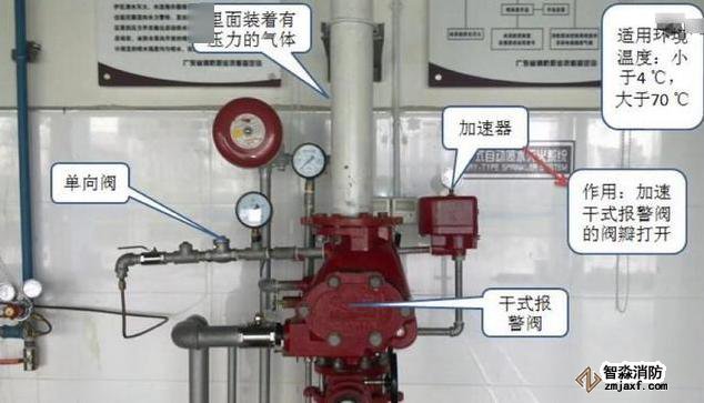 包括闭式喷头、管网干式报警阀组、充气设备、报警控制装备和末端试水装置、给水设施等。