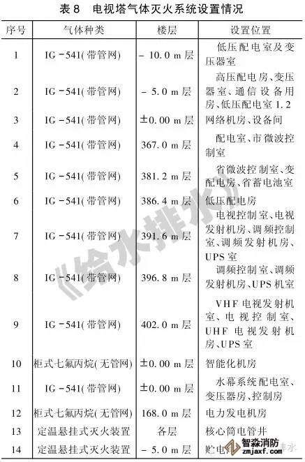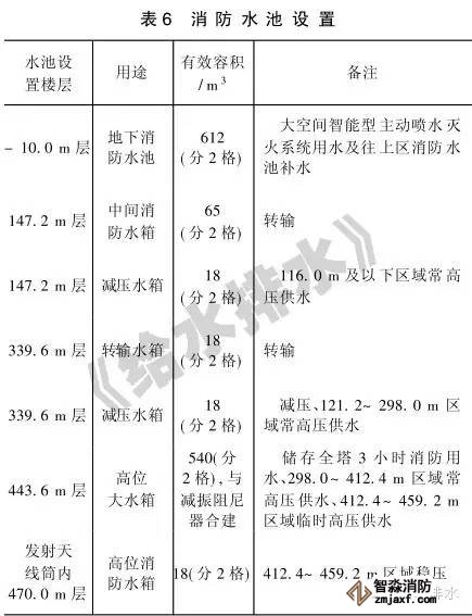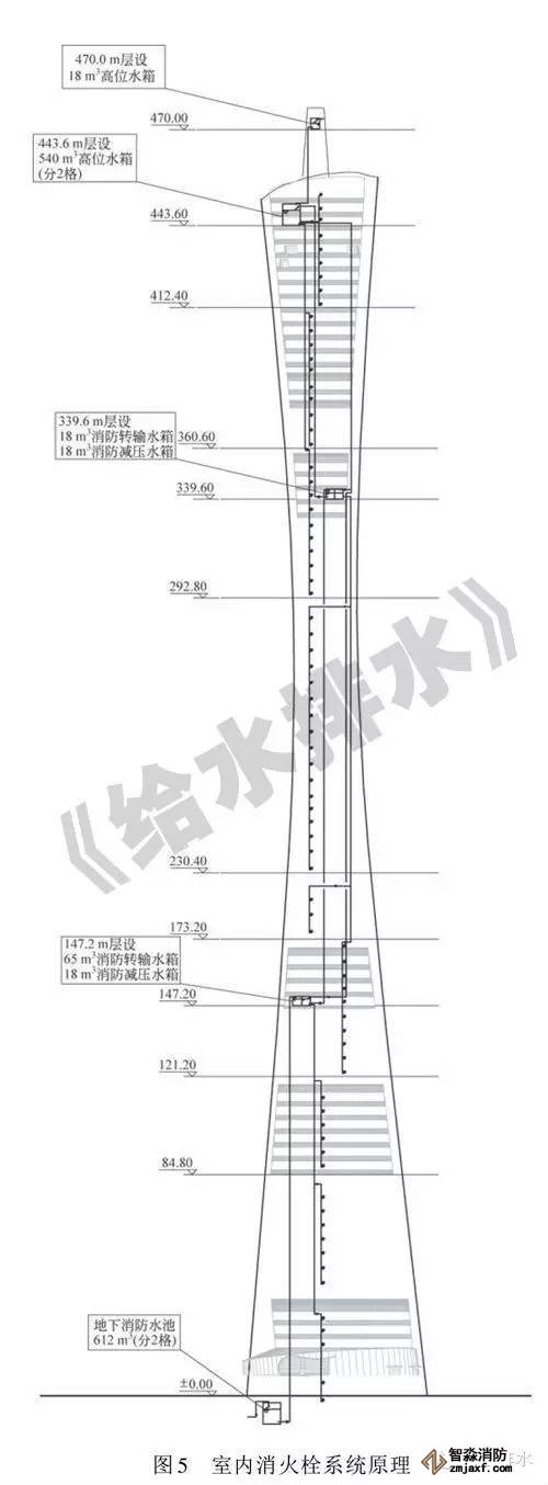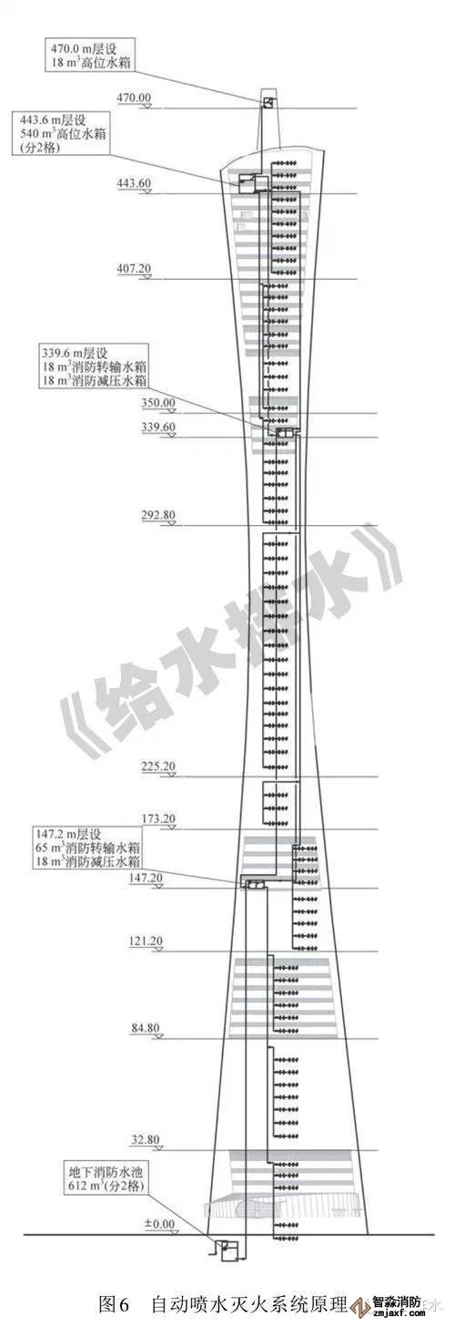 在407.2 米以上区域的自动喷水灭火系统采用临时高压供水系统,利用设置在443.6米的540立方米的乐鱼在线(中国)水池和高区消喷加压泵组提供水量和水压;并在发射天线筒内473.3米处设置18立方米的稳压水箱,提供系统的初期用水量。