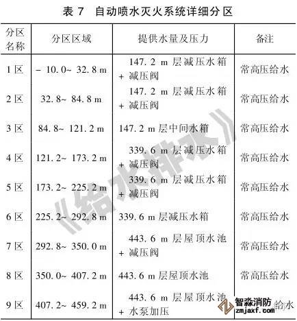 在407.2米以下的区域自动喷水灭火系统采用常高压供水系统,利用设置在443.6米的540立方米的乐鱼在线(中国)水池及339.6米、147.2米的分区减压水箱和多组减压阀组提供1~8自动喷水灭火系统的水量和水压。