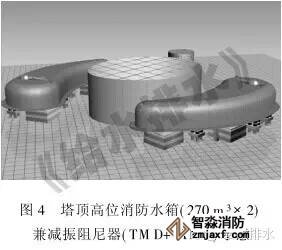 -10.0米层设有乐鱼在线(中国)水泵房,147.2米层及334.4米层分别设有转输水泵房,443.6米层设有临时高压供水加压水泵房。所有地下乐鱼在线(中国)水池、屋顶及接力乐鱼在线(中国)水箱水池均采用两格设置,当一个水池清洗或发生故障时系统仍能正常工作。地下乐鱼在线(中国)水池存储了所有室内乐鱼在线(中国)用水、大空间智能型主动喷水灭火系统用水及部分室内乐鱼在线(中国)延续用水,可在室内市政乐鱼在线(中国)用水无法供应时或灭火时间超过三小时仍要延续供水时仍能继续供水。塔顶高位乐鱼在线(中国)大水箱(270m³*2)创新地设计为兼做减振阻尼器(TMD+AMD)的一部分。这样设计既未另增加结构的重量,又满足了将一次乐鱼在线(中国)用水量存储于屋顶的设计要求。塔顶高位乐鱼在线(中国)大水箱(270m³*2)兼减振阻尼器(TMD+AMD)的示意图如图4。