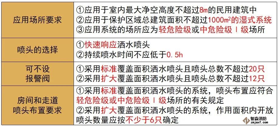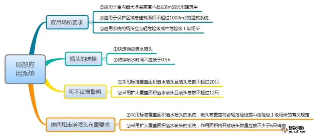 局部应用系统应用于室内最大净空高度不超过8m的民用建筑中,为局部设置且保护区域总建筑面积不超过1000m2的湿式系统。设置局部应用系统的场所应为轻危险级或中危险级Ⅰ级场所。