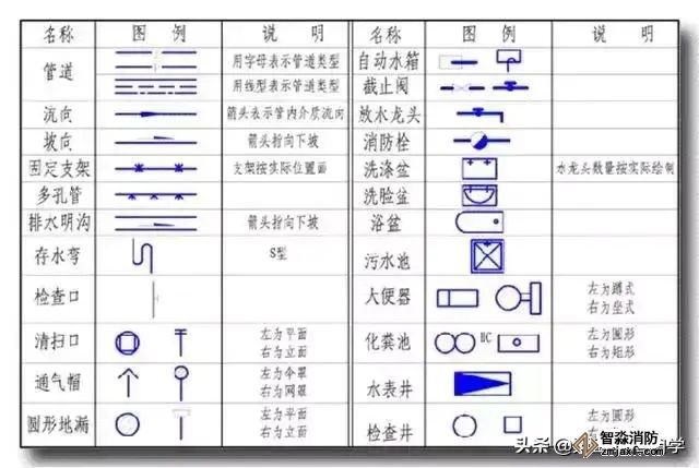 根据建筑规划,在设计图纸中,用水设备的种类、数量、位置,均要作出给水和排水平面布置;各种功能管道、管道附件、卫生器具、用水设备,如消火栓箱、喷头等,均应用各种图例表示;各种横干管、立管、支管的管径、坡度等,均应标出。平面图上管道都用单线绘出,沿墙敷设时不注管道距墙面的距离。