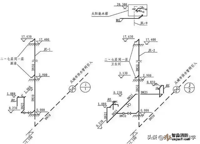 4、图纸没有特别说明,一般情况下:给水管标注的是管道中心标高,排水管标注的是管道底标高。