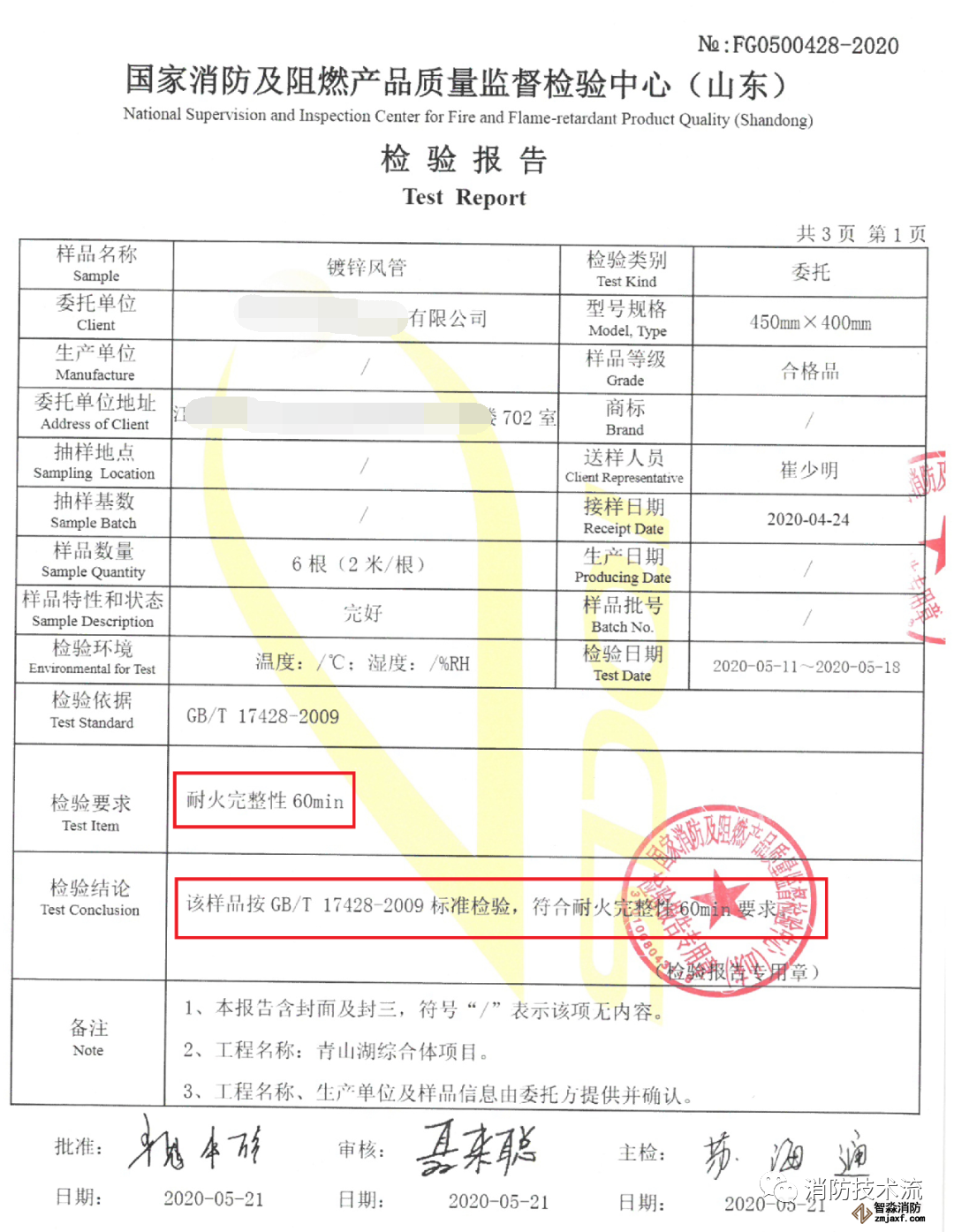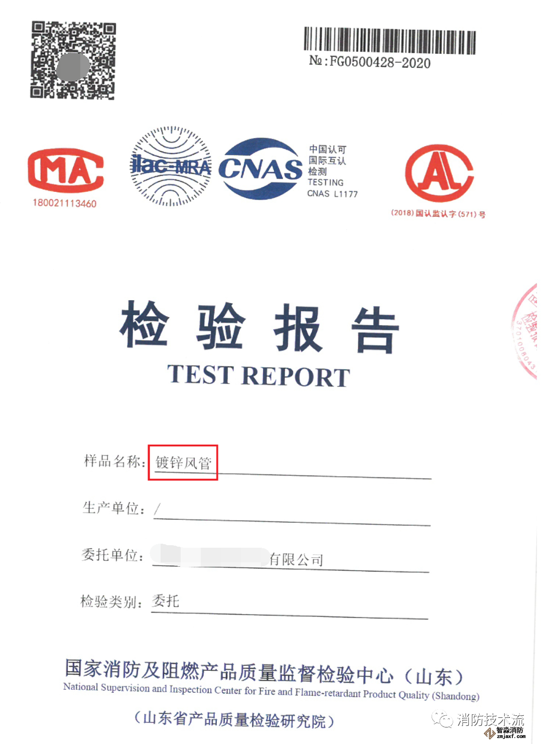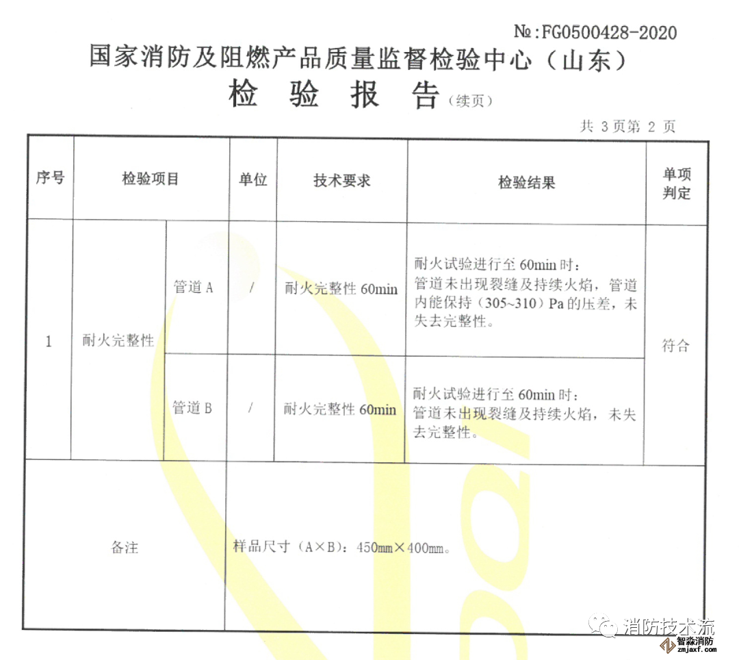 以下一份出自国家乐鱼在线(中国)及阻燃产品质量监督检验中心(山东)的检验报告,由某施工单位委托对镀锌风管进行耐火完整性的检验,结果显示送检的镀锌风管能满足耐火完整性1小时要求。