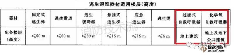 适用楼层:地上建筑可配备过滤式自救呼吸器或化学氧自救呼吸器,高于30m的楼层内应配备防护时间不少于20min的自救呼吸器。地下建筑应配备化学氧自救呼吸器。