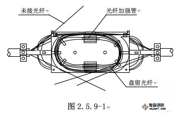 2.5.9-1完成光纤接续后,应把光纤余长在盘留板内进行盘留。盘留时应将A、B两侧光纤同时压花盘留,盘留圈数控制为偶数,以达到相互抵消扭力的作用。最后将光纤接头保护管按顺序放入固定槽内。见图2..5.9-1。