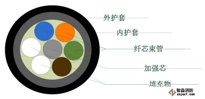 光缆的基本由五部分组成:外护套、内护套、纤芯束管、加强芯、填充物。