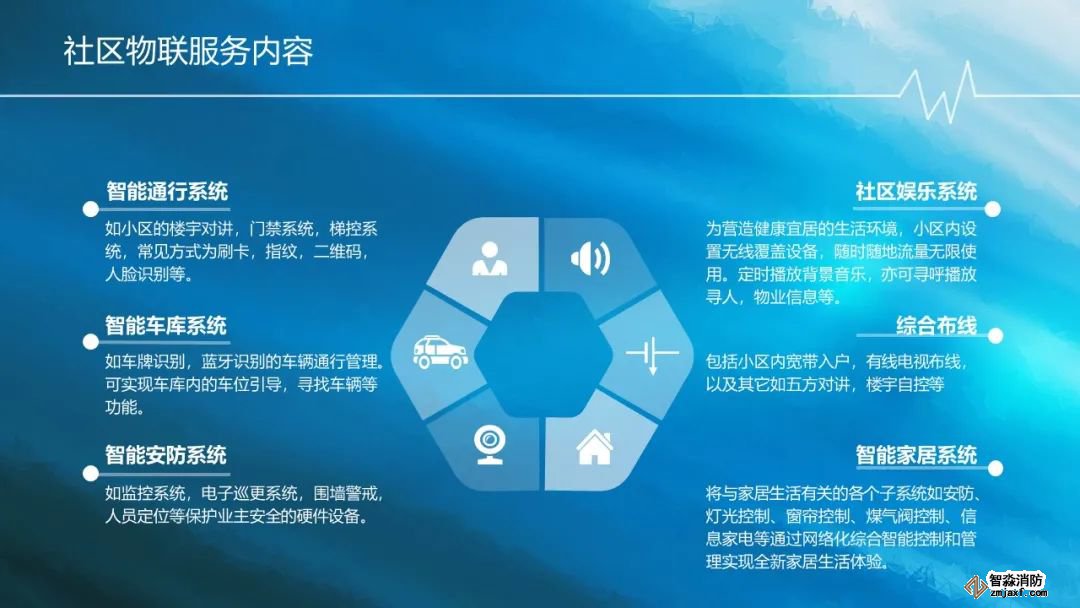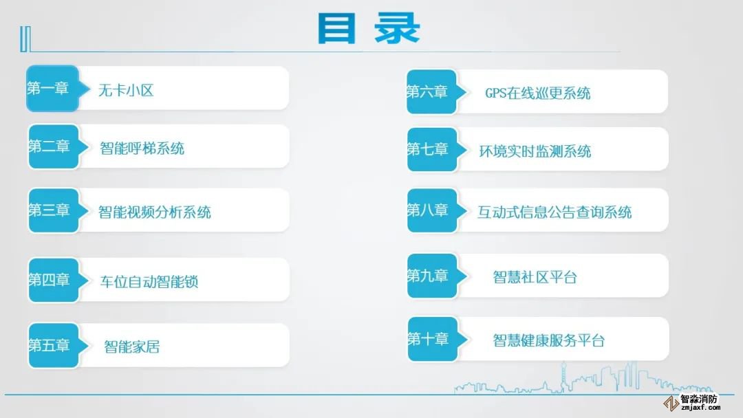 1、智慧社区智能化弱电系统解决方案,主要包含可视对讲系统、周界防范系统、室内报价系统等等。