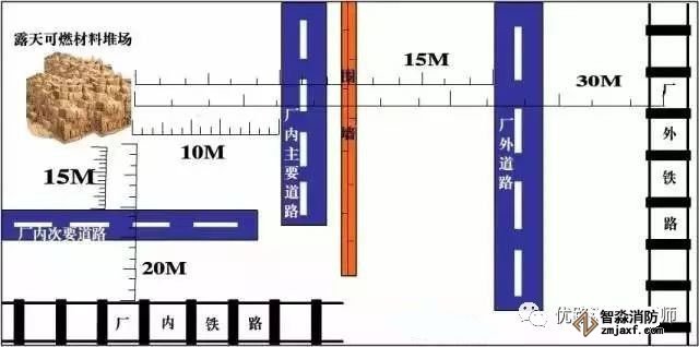 主要依据:露天、半露天可燃材料堆场与厂外铁路中心线、厂内铁路中心线、厂外道路路边、厂内主要道路路边和厂内次要道路路边的防火间距不应小于30、20、15、10和5米。《建筑设计防火规范》(GB50016-2014)4.5.3