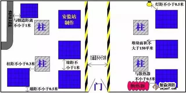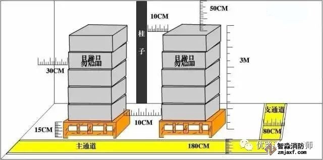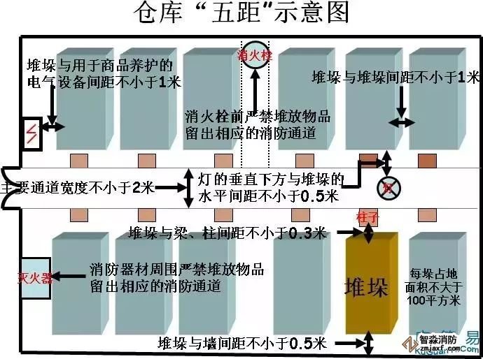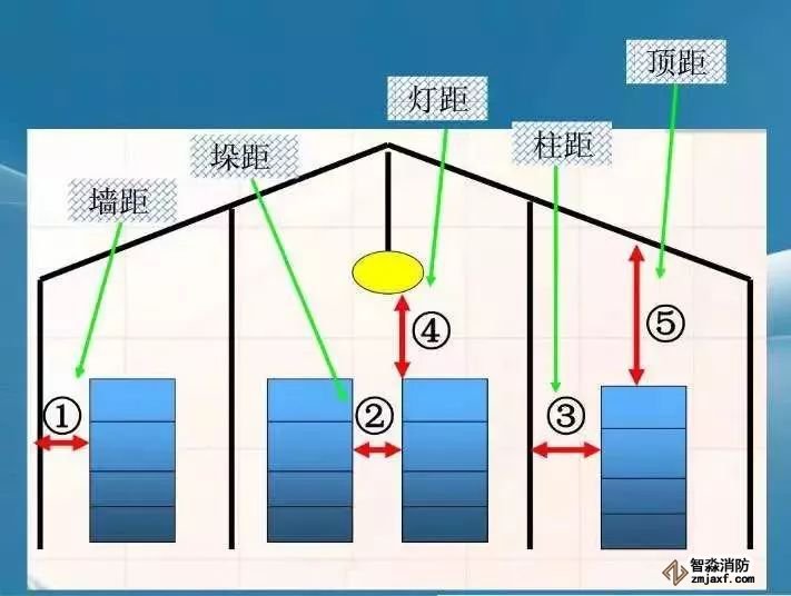 “柱距”的作用:发生火灾导致货物起火后,如果货物紧挨着柱子,大火会对柱子直接灼烧,导致柱子的结构发生变化,逐渐尚失对房屋的承重,最后可能造成房屋整体垮塌。