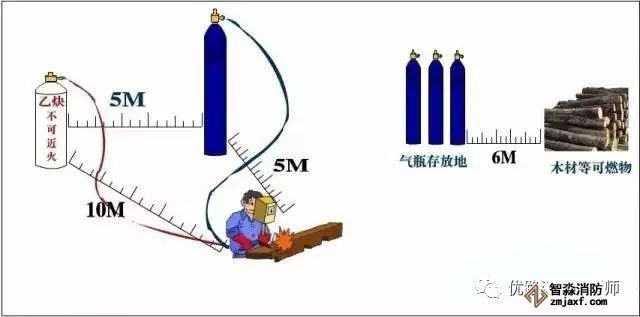 主要依据:气瓶在储存时必须与可燃物、易燃液体隔离,并且远离容易引燃的材料(诸如木材、纸张、包装材料、油脂等)至少6 m 以上。《焊接与切割安全》(GB9448-1999)10.5.3 气瓶必须距离实际焊接或切割作业点足够远(一般为5 m 以上),以免接触火花、热渣或火焰,否则必须提供耐火屏障。《焊接与切割安全》(GB9448-1999)10.5.4 乙炔瓶的放置地点,不得靠近热源和电器设备,与明火的距离不得小于10m。《溶解乙炔气瓶安全监察规程》第64条
