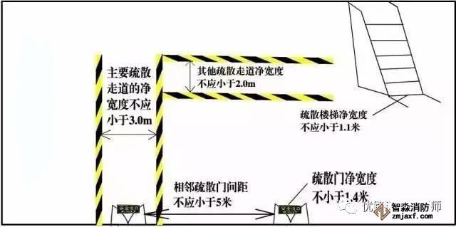主要依据:每个房间相邻两个疏散门最近边缘之间的水平距离不应小于5米。《建筑设计防火规范》(GB50016-2014)5.5.2 除本规范另有规定外,公共建筑内疏散门和安全出口的净宽度不应小于0.9米,疏散走道和疏散楼梯的净宽度不应小于1.1米。《建筑设计防火规范》(GB50016-2014)5.5.18 主要疏散走道的净宽度不应小于3.0m,其他疏散走道净宽度不应小于2.0m;《人员密集场所乐鱼在线(中国)安全管理》(GA654-2006)8.3.3.2 人员密集的公共场所、观众厅的疏散门不应设置门槛,其净宽度不应小于1.4米,且紧靠门口内外各1.4米范围内不应设置踏步。《建筑设计防火规范》(GB50016-2014)5.5.19