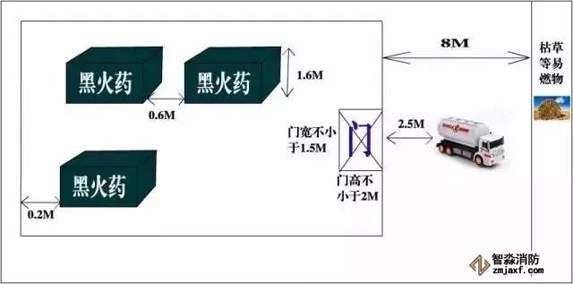 主要依据:《小型民用爆炸物品储存库安全规范》(GA 838—2009) 9.1.4 储存库内任一点到门口的距离不应大于15m,门的宽度不宜小于1.5m,高度不宜小于2.0m。10.1 储存库门口8m 范围内不应有枯草等易燃物,储存库区内以及围墙外15m 范围内不应有针叶树和竹林等易燃油性植物。16.2.3 堆垛之间应留有检查、清点民用爆炸物品的通道,通道宽度不应小于0.6m,堆垛边缘与墙的距离不应小于0.2m,宜在地面画定置线。16.2.4 各种民用爆炸物品整箱堆放高度,工业雷管、黑火药不应超过1.6m,炸药、索类不应超过1.8m,宜在墙面画定高线。16.4.5 民用爆炸物品的装卸作业宜在白天进行,押运员应在现场监装,无关人员和车辆禁止靠近,运输车辆离库门不应小于2.5m。