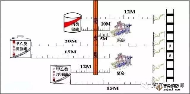 主要依据:甲乙拱顶罐与其泵房、铁路及装卸鹤管的防火间距为15米和20米;甲乙浮顶罐与其泵房、铁路及装卸鹤管的防火间距为12米和15米;丙类液体储罐与其泵房、铁路及装卸鹤管的防火间距为10米和12米。泵房和装卸鹤管与储罐防火堤外侧基脚线的距离不应小于5米。《建筑设计防火规范》(GB50016-2014)4.2.7