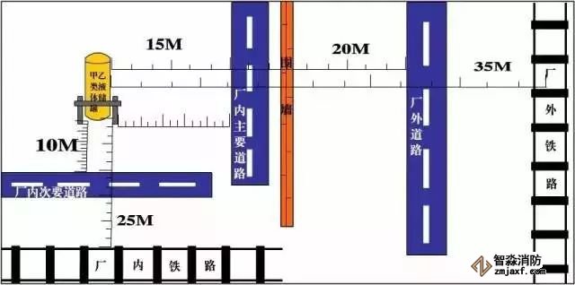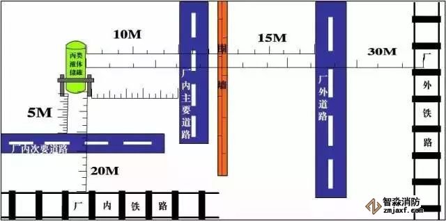 主要依据:丙类液体储罐与厂外铁路中心线、厂内铁路中心线、厂外道路路边、厂内主要道路路边和厂内次要道路路边的防火间距不应小于30、20、15、10和5米。《建筑设计防火规范》(GB50016-2014)4.2.9