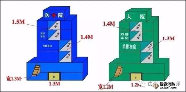主要依据:高层医疗建筑楼梯间的首层疏散门和首层疏散外门的宽度为1.3米,单排布房的走道宽1.4米,双排布房的走道宽1.5米,疏散楼梯宽1.3米。其它高层建筑楼梯间的首层疏散门和首层疏散外门的宽度为1.2米,单排布房的走道宽1.3米,双排布房的走道宽1.4米,疏散楼梯宽1.2米。 《建筑设计防火规范》(GB50016-2014)5.5.18