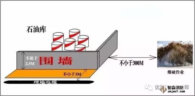 主要依据:油库四周应设高度不低于2. 5m的实体围墙。《石油库设计规范》(GB50074-2014)5.3.3 油库的围墙与爆破作业场地(如采石场)的安全距离,不应小于300m。《石油库设计规范》(GB50074-2014)4.0.12 石油库用的库外埋地电缆与石油库围墙的距离不应小于3m。《石油库设计规范》(GB50074-2014)4.0.13