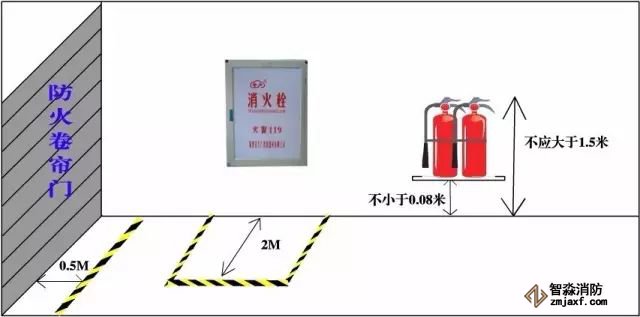 主要依据:灭火器的摆放应稳固,其铭牌应朝外。手提式灭火器宜设置在灭火器箱内或挂钩、托架上,其顶部离地面高度不应大于1. 50M ;底部离地面高度不宜小于 0. 08M 。灭火器箱不得上锁。《建筑灭火器配置设计规范》(GB50140一2005)5.1.3 防火卷帘门两侧各0.5m范围内不得堆放物品,并应用黄色标识线划定范围。《人员密集场所乐鱼在线(中国)安全管理》(GA654-2006)8.3.7 室外消火栓不应埋压、圈占;距室外消火栓、水泵接合器2.0m范围内不得设置影响其正常使用的障碍物。《人员密集场所乐鱼在线(中国)安全管理》(GA654-2006)7.6.2.3