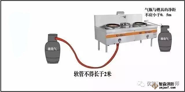 主要依据:气瓶与燃具的净距不应小于0.5m。《城 镇 燃 气 设 计 规 范》(GB50028-2006)8.7.2 软管与家用燃具连接时,其长度不应超过2m,并不得有接口。《城 镇 燃 气 设 计 规 范》(GB50028-2006)10.2.8