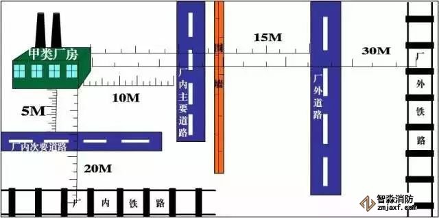 主要依据:散发可燃气体、可燃蒸气的甲类厂房与厂外铁路中心线、厂内铁路中心线、厂外道路路边、厂内主要道路路边和厂内次要道路路边的防火间距不应小于30、20、15、10和5米。《建筑设计防火规范》(GB50016-2014)3.4.3