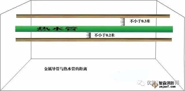 主要依据:金属导管和金属槽盒敷设时,敷设在热水管下方时,不宜小于 0.2m;在上方时,不宜小于0.3m;《低压配电设计规范》(GB50054-2011)7.2.11