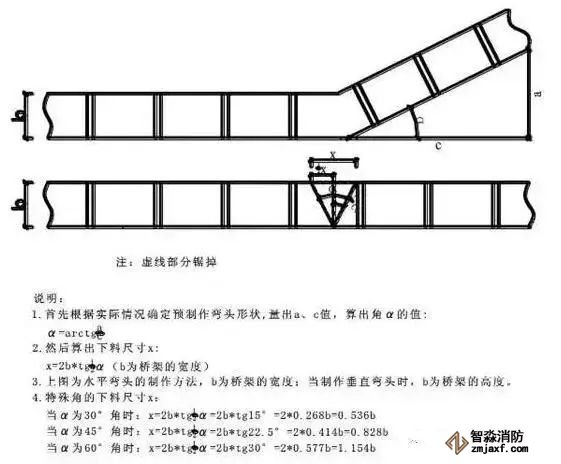 电缆桥架安装过程中,用到的弯头一般有三种:一种是水平弯,一是垂直上下弯,还有一种是"之"字弯。以下举例说明这些弯头制作方法及公式:例:400×150的桥架做45°"之"字弯从桥架侧面取15cm×0.8在桥架底部画点将这段距离等分,然后三个点连接就成一个45°的等腰三角形(另一边用同一方法),然后将这个三角切掉就形成一个45°弯,然后再用要做的高度×1.41为最里边的顶点再画三角形,方向与前面那个相反,做出来就是一个45°之字弯。90°弯是取要做的那一面的2倍画三角,例如400×150做水平弯头,则取400×2画三角切掉就行了,如果要做垂直弯头则取150×2。
